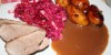 Skær andebrysterne i fine stykker og ret an med tilbehøret.