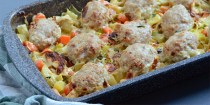 Kanongode frikadeller i fad med porrer, gulerødder og kartofler
