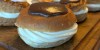 Dejen deles i 2 lige store portioner. Hver portion rulles tyndt ud og skæres i ca. 10 firkanter. Læg 2 teskefulde creme på midten af hver firkant, saml de fire hjørner og tryk dem godt sammen. Saml så de fire ”nye” hjørner og sørg for, at de er lukket så tæt som muligt. Sæt bollerne på pladen med lukningen nedad.