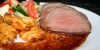 Til sidst skæres kødet ud i skiver og serveres med champignonerne.