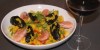 Varm bønnerne og fordel dem over de stegte tortillas. Herover fordeles salat, kødstrimler, tomatskiver, løgringe og avocadoskiver.