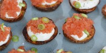 Disse lækre blinis er toppet med stenbiderrogn, der smager skønt i kombination med creme fraichen og de finthakkede rødløg. Opskriften er meget nem, og blinis pandekagerne kan man enten lave selv eller købe færdige i supermarkedet.