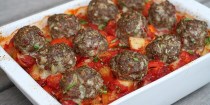 Krydrede oksedeller med grøntsager og tomatsovs i ovn