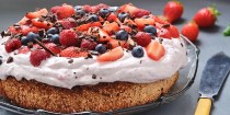 Hvis det skal være lidt nemmere, kan jeg også anbefale den her kage med mandelbund og den lækreste bærskum på toppen: