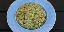 Hæld det hele i et ildfast fad og bag i ovnen ved 230 grader i ca. 30 minutter, eller til kyllingen er gennemstegt og grøntsagerne begynder at få lidt brændte kanter.