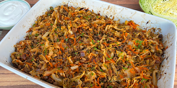Nem og fedtfattig aftensmad med hakket oksekød og grøntsager. Den er proppet med smag selvom den kun indeholder 490 kalorier pr. person.