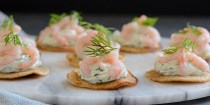 Fordel rejerne rundt omkring på cirklerne, og pynt med lidt frisk dild. Servér med det samme.