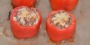 Halvér peberfrugterne, fjern kerner og de hvide membraner, og læg dem op i et stort fad eller en bradepande. Fordel fyldet i de halve peberfrugter.