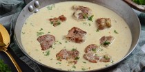 Pil hvidløg, og riv det på den fine side af rivejernet. Rør det sammen med creme fraiche og sennep, og smag dressingen til med salt og peber.