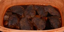 Bland tomatpuré, hakkede tomater, oksebouillon, paprika og salt sammen. Krydr godt med peber, og hæld sovsen i stegesoen. Tilsæt laurbærblade, og læg låg på.