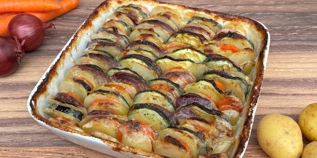 Lækkert tilbehør i form kartofler og grøntsager i fad med fløde. Det ser også flot ud, så det er oplagt som gæstemad.