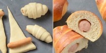 Skær pølserne i halve og rul dej omkring dem (rul fra den brede ende og ind mod spidsen). Læg pølsehornene på en bageplade med bagepapir og lad dem efterhæve i 1 time ved stuetemperatur.