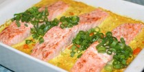 - Vend kyllingeinderfileterne med olie, og krydr godt med salt og peber. Læg dem ovenpå grøntsager og sovs i fadet.