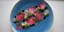Stil grøntsagsskiverne på højkant oveni fløden i fadet.