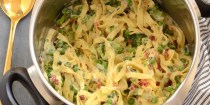Ultra lækker one pot pasta, der både indeholder kylling, bacon og en fantastisk cremet sovs lavet på fløde og parmesan. Retten kan hurtigt bikses sammen, og den er dejlig nem at lave.