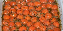 Fordel timiankvistene ovenpå, og bag tomaterne i ovnen ved 120 grader varmluft i ca. 1 time og 20 minutter.