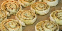 Rul dejen sammen, og skær den ud i skiver. Læg pizzasneglene på en bageplade beklædt med bagepapir.