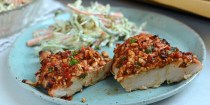 Rør den røde pesto sammen med olivenolie, balsamicoeddike og citronsaft. Krydr godt med salt og peber, og smag evt. til med lidt ekstra citronsaft.