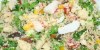 Bland ris, kylling, grøntsager og halvdelen af persillen sammen i et fad eller en skål. Drys rissalaten med peanuts, rosiner og det sidste persille.