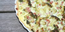 I tærten på billedet har jeg brugt en blanding af peberfrugt, rødløg, spinat og stegt bacon som fyld.