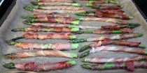 Skyl asparges og forårsløg. Bræk den træede ende af asparges, så du kun har aspargeshovederne tilbage. Skær forårsløgene i mindre stykker, så de er ca. på størrelse med aspargeshovederne. Vend først asparges og dernæst forårsløg i olien i skålen.