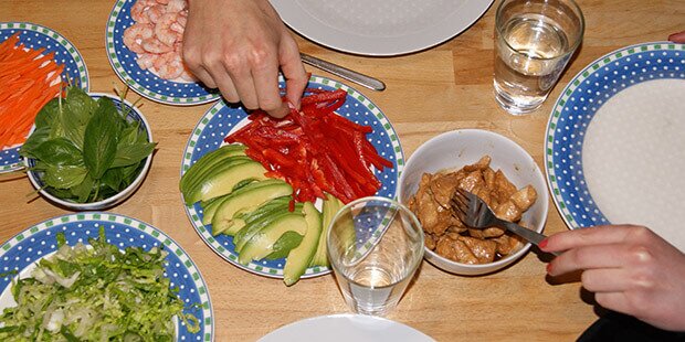 Gør det samme med resten af arkene, eller server alt fyldet, så I løbende kan lave de lækre rispapirruller, mens I spiser. Rullerne kan også fyldes med kylling i teryakisauce, rød peberfrugt, gulerødder, osv.